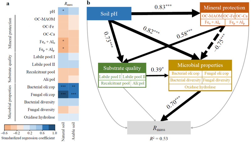▲图2 | 土壤pH、矿物保护、底物质量和微生物特征因子对单位微生物呼吸速率(Rmass)的调控作用。