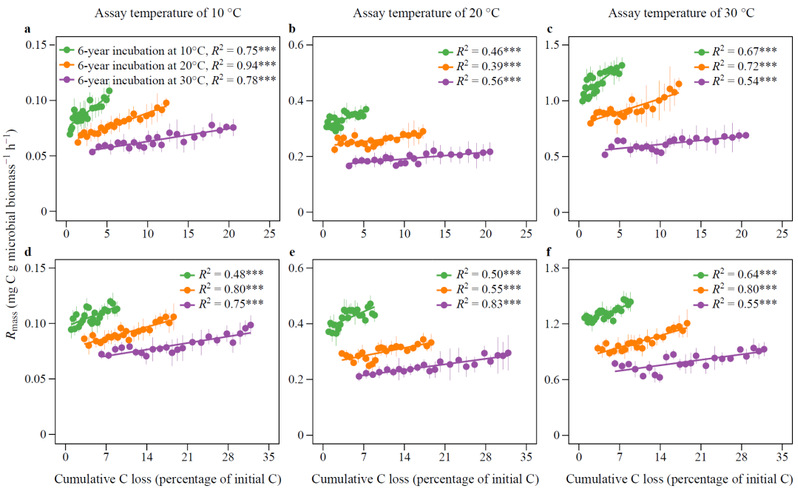 为回答这一问题,本研究采集了两种典型生态系统(自然林和农田)土壤,在不同温度(10、20和30°C)开展了6年的长期培养实验,使得土壤微生物分解过程从以易分解碳为主到以难分解碳为主转变,并定期在三个短期测试温度(10、20和30°C)测定土壤微生物呼吸速率。本研究主要通过单位微生物呼吸速率(Rmass,microbial respiration rate per unit microbial biomass)反映土壤微生物呼吸热适应;若热适应存在,在相同的短期测试温度下,长期培养温度越高Rmass越低。