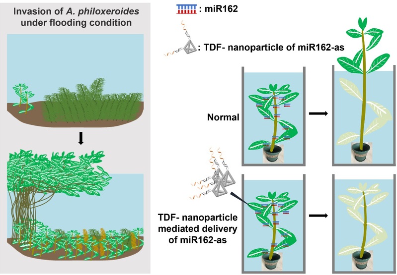 图注:左图展示了喜旱莲子草在水体系统中的入侵过程,其快速扩张严重威胁其他水生植物的生存,进而导致生态系统失衡;右图展示了通过纳米颗粒递送miR162-as抑制喜旱莲子草在水淹条件下的茎伸长,使其无法伸出水面,最终导致植物死亡;TDF-nanoparticle: 四面体纳米颗粒;miR162-as: miR162反义RNA。