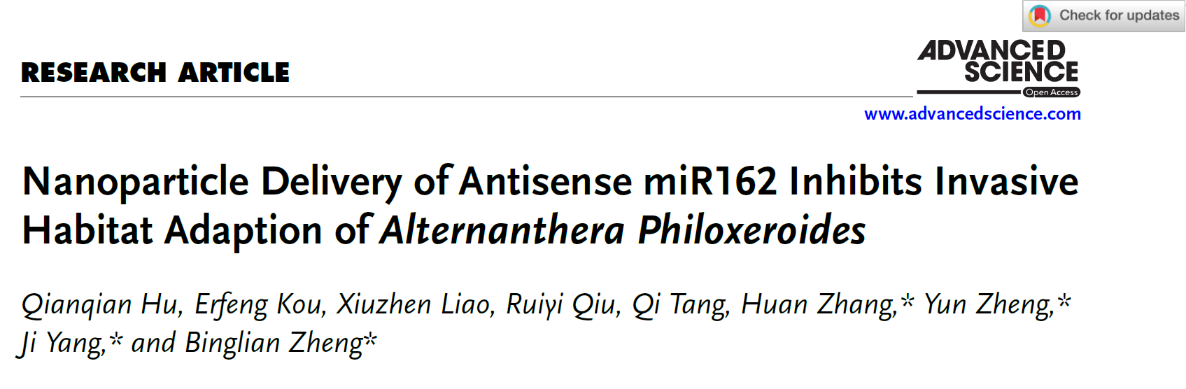 2025年3月31日,郑丙莲课题组在Advanced Science在线发表了题为“Nanoparticle delivery of antisense miR162 inhibits invasive habitat adaption of Alternanthera philoxeroides”的研究论文。该研究揭示了miR162能够快速响应环境变化,促进喜旱莲子草节间茎伸长,从而帮助其适应水生环境的分子机制。