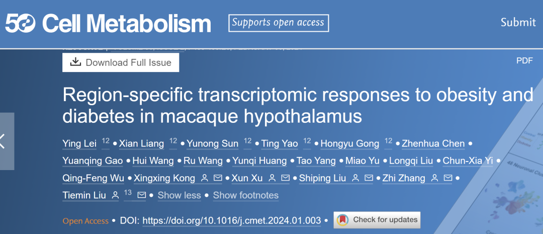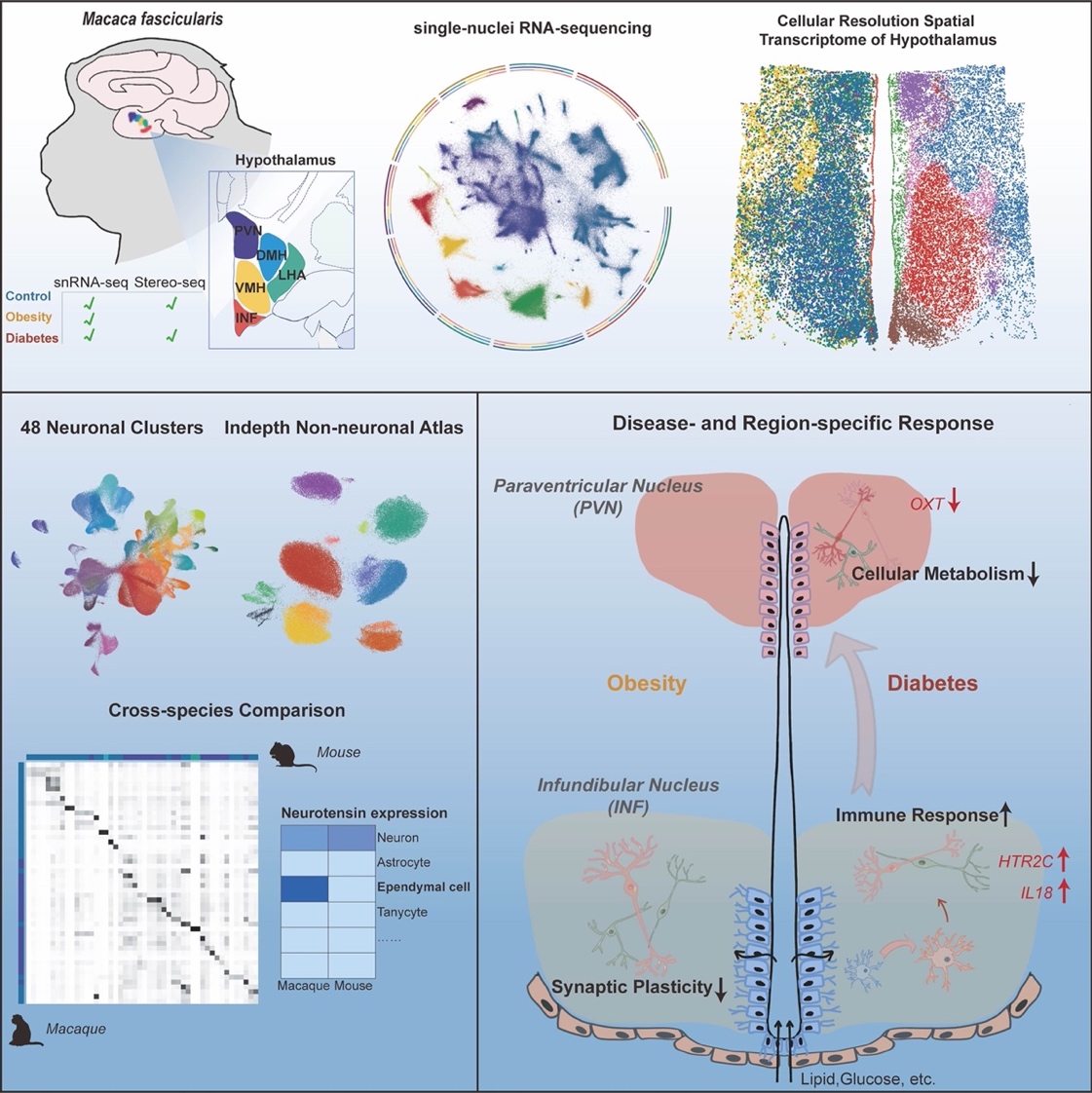 2024年2月6日,风车动漫 刘铁民、张智和孔星星课题组与华大生命科学研究院刘石平和徐讯团队合作,在Cell Metabolism杂志发表了题为Region-specific transcriptomic responses to obesity and diabetes in macaque hypothalamus的研究。该研究以灵长类食蟹猴为模型,首次系统性阐述了肥胖和糖尿病两种不同代谢疾病下,灵长类下丘脑的空间转录组学响应,利用单细胞核RNA测序和空间转录组测序技术,直接检测了481,802个个体细胞中的多个分子标志物,揭示了肥胖和糖尿病对食蟹猴下丘脑的不同脑区、多种细胞类型的空间分子改变。研究结果助于我们深入了解不同疾病的代谢紊乱机制。