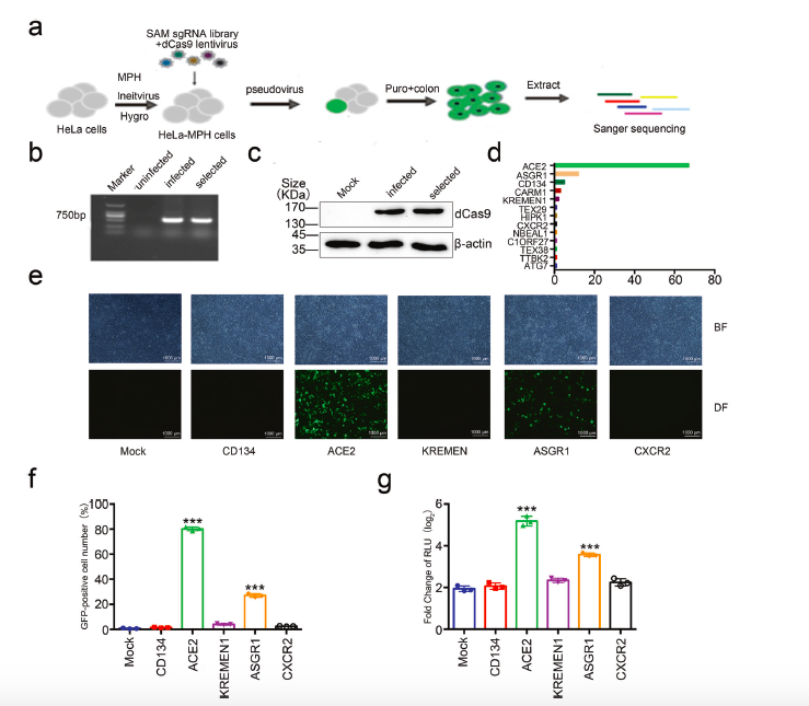 图1:利用CRISPR全基因组激活文库筛选到ASGR1是潜在的新冠病毒感染受体