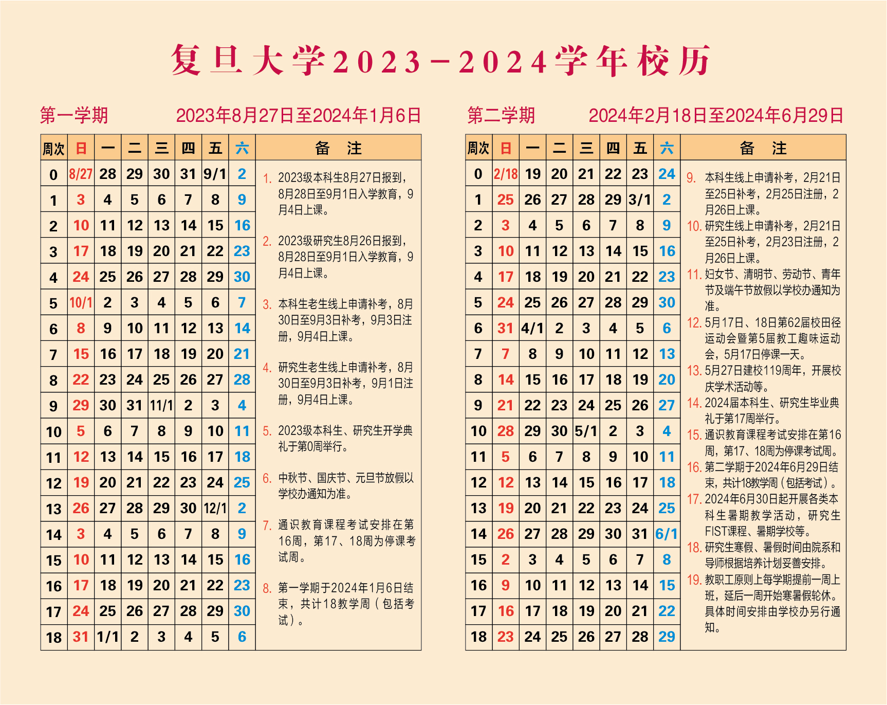 2023年秋季学期于9月4日(第1周周一)开始上课,本学期授课时间16周(12月22日为第16周周五),第17,18周为集中考试周。随堂考试安排在第16周上课时间。中秋国庆放假9月29日-10月6日,10月7日周六执行10月5日周四教学任务,10月8日周日执行10月6日周五教学任务。原周六周日教学任务应分别对调到10月5日和10月6日执行,或申请改到其他时间执行(通过调课申请)。元旦安排另行通知。