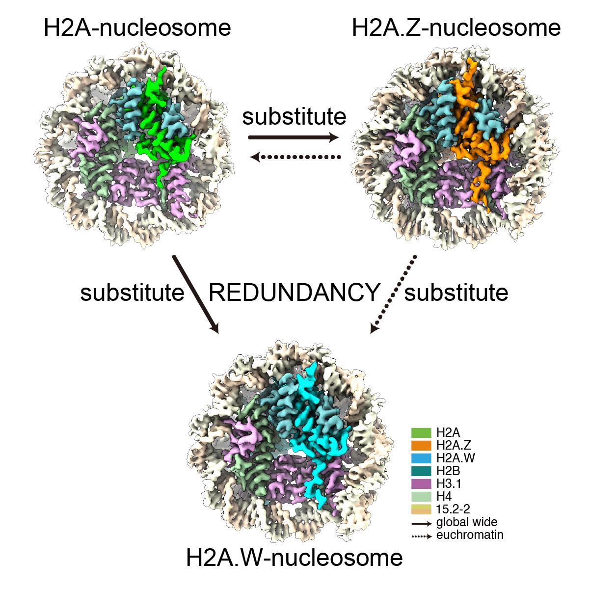 真核生物中存在多种组蛋白H2A变体,然而植物中H2A及其变体间的功能关系仍不甚明晰。本研究通过CRISPR/Cas9基因编辑技术,在拟南芥中制备了缺失四个H2A同源基因的突变体,系统分析了H2A、H2A.Z和H2A.W之间的功能与结构关联。RNA测序及表型分析表明,与野生型相比,缺失H2A、H2A.Z或H2A.W的突变体在基因转录和植物发育方面呈现温和变化。染色质免疫沉淀测序显示,H2A能够在全基因组范围内(包括常染色质和异染色质区域)替代H2A.Z和H2A.W,而H2A.Z对H2A和H2A.W的替代主要局限于常染色质区域。