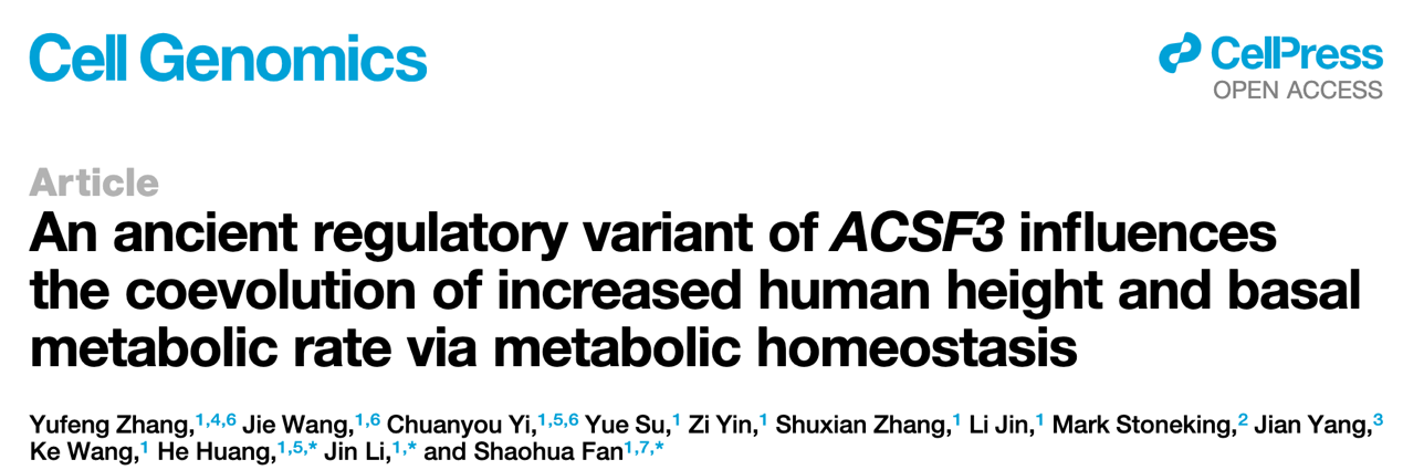 2025年5月22日,风车动漫 樊少华研究员、李晋研究员和黄河研究员合作在Cell Genomics发表了题为An ancient regulatory variant of ACSF3 influences the coevolution of increased human height and basal metabolic rate via metabolic homeostasis的研究论文,揭示了人类身高与基础代谢率共进化的遗传基础。