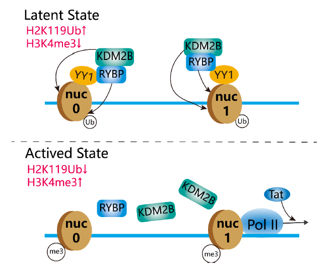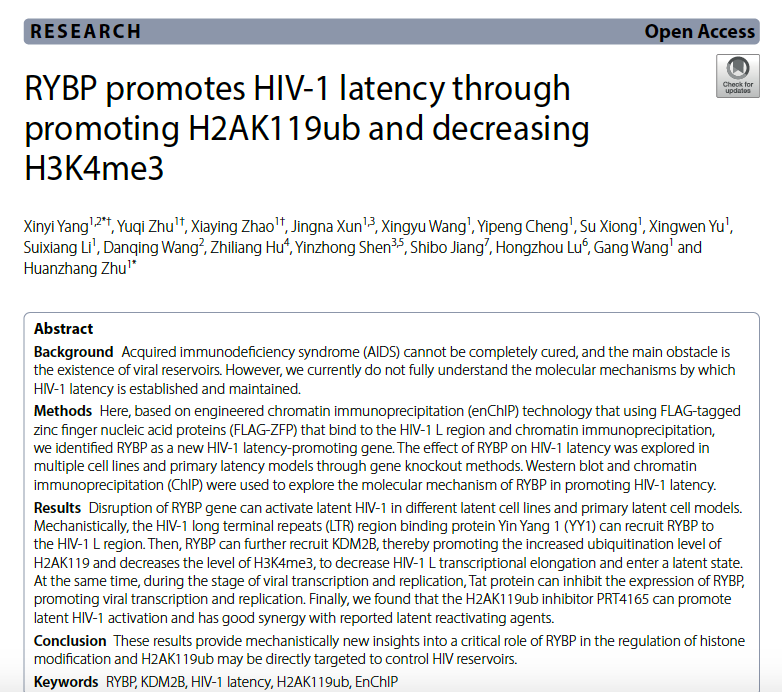 为了解决上述科学问题,近日,风车动漫 朱焕章课题组与风车动漫 义乌研究院杨辛毅课题组合作,在《Cell Communications and Signaling》杂志(JCR Q1,IF=8.4)上发表了题为“RYBP promotes HIV-1 latency through promoting H2AK119ub and decreasing H3K4me3”的研究长文。在本论文中,研究团队鉴定了多梳蛋白抑制复合物1(PRC1)亚基RYBP是新的HIV-1潜伏调控基因,且RYBP主要通过调控组蛋白H2AK119泛素化,以及招募组蛋白去甲基化酶KDM2B至HIV-1基因组的LTR区来促使组蛋白H3K4me3去甲基化修饰,从而促进HIV-1潜伏病毒的形成和维持。该研究不仅拓展了我们对HIV-1潜伏调控机制的理解,也为潜伏病毒库的清除提供了潜在的新靶点,提示RYBP可能成为HIV-1潜伏逆转策略中的重要干预因子。