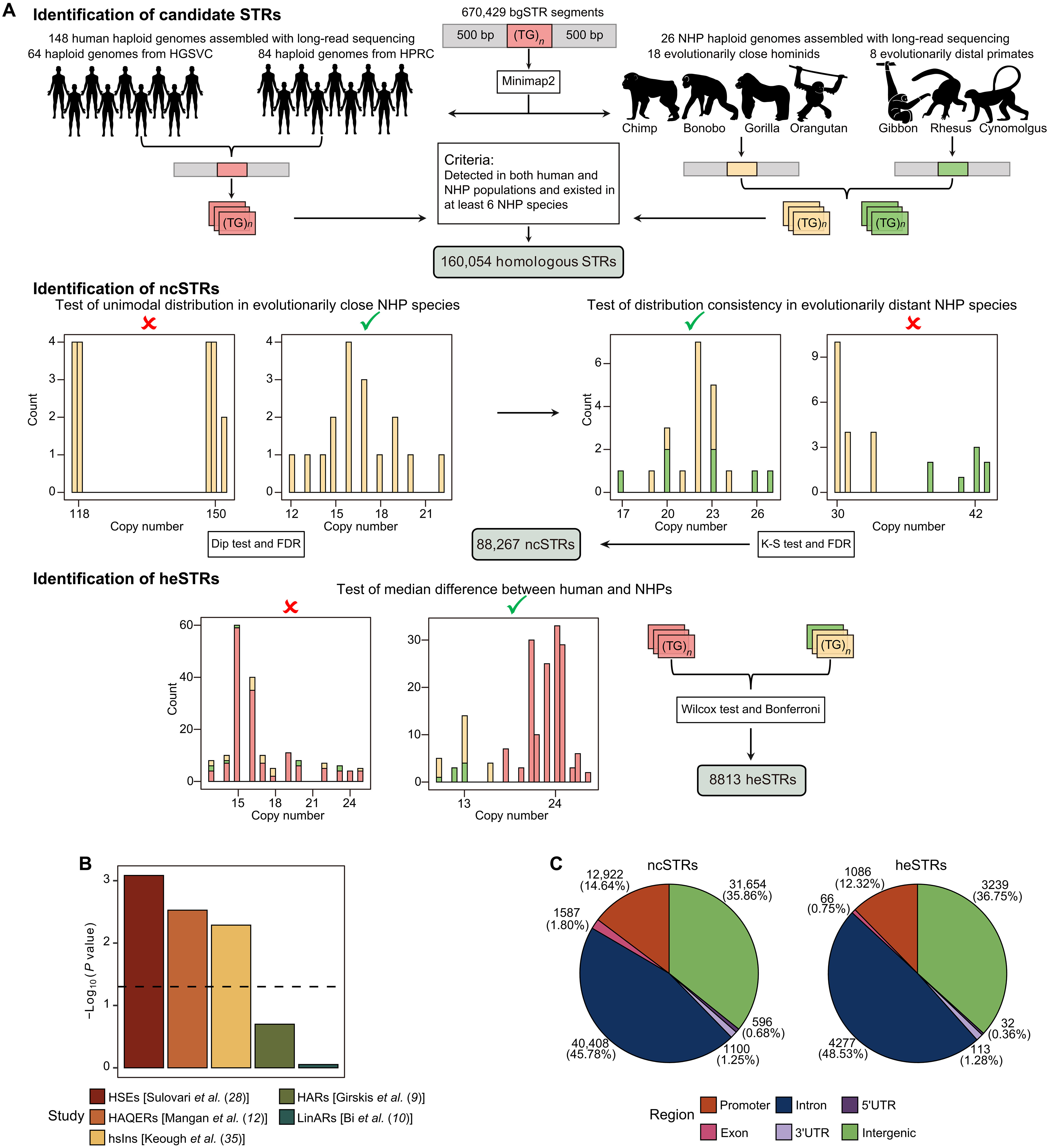 为了可靠地鉴定人类特异性扩增的STRs,研究团队设计了严格的筛选策略。从hg38参考基因组的670,429个STRs出发,通过多步骤统计检验:首先筛选出160,054个在人类和非人灵长类中都存在的同源STRs,再通过单峰性检验和分布一致性检验获得88,267个保守型ncSTRs,最终通过Wilcoxon检验比较148个人类基因组与26个非人灵长类基因组的拷贝数差异,鉴定出8813个在人类中显著扩增的heSTRs。