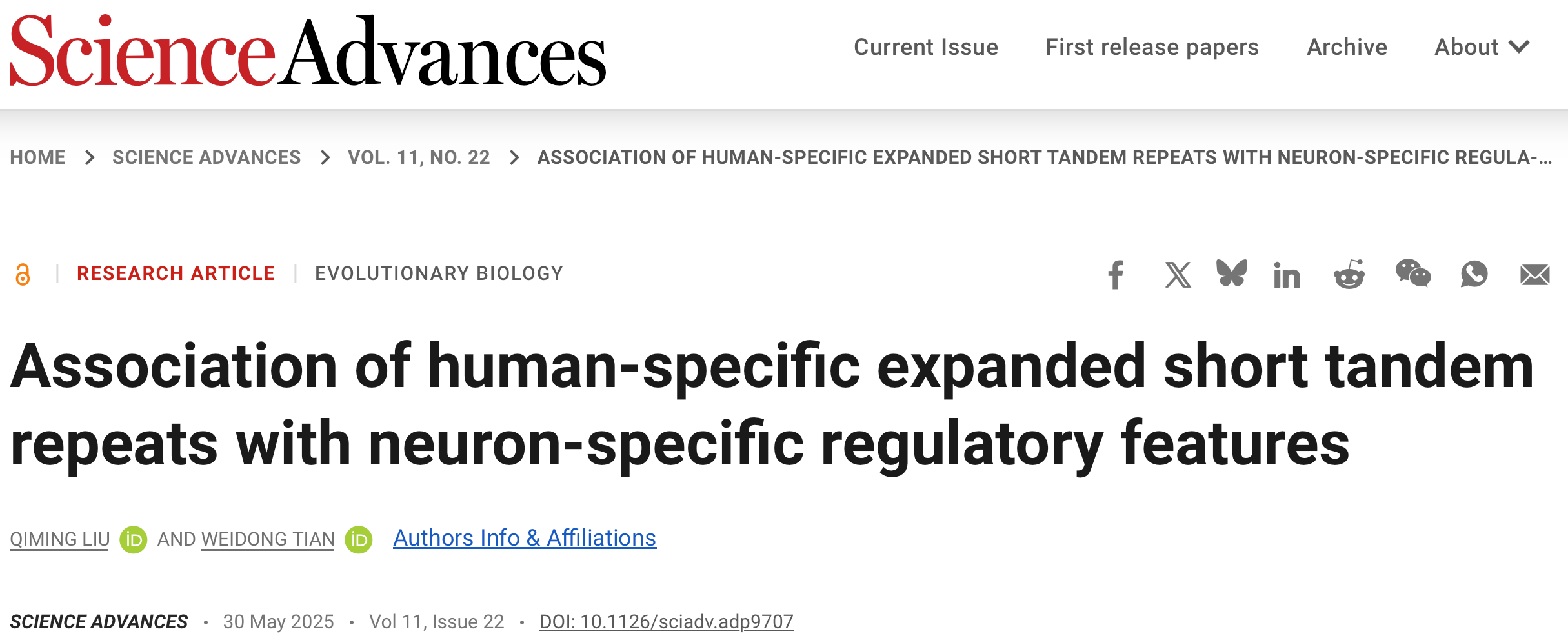 2025年5月30日,风车动漫 田卫东教授团队在Science Advances发表题为Association of human-specific expanded short tandem repeats with neuron-specific regulatory features的研究论文。该研究首次系统性地鉴定了8813个人类特异性扩增的短串联重复序列(heSTRs),并揭示了它们在神经元特异性调控中的重要作用,为理解人类大脑进化机制和神经发育疾病的遗传基础提供了全新视角。