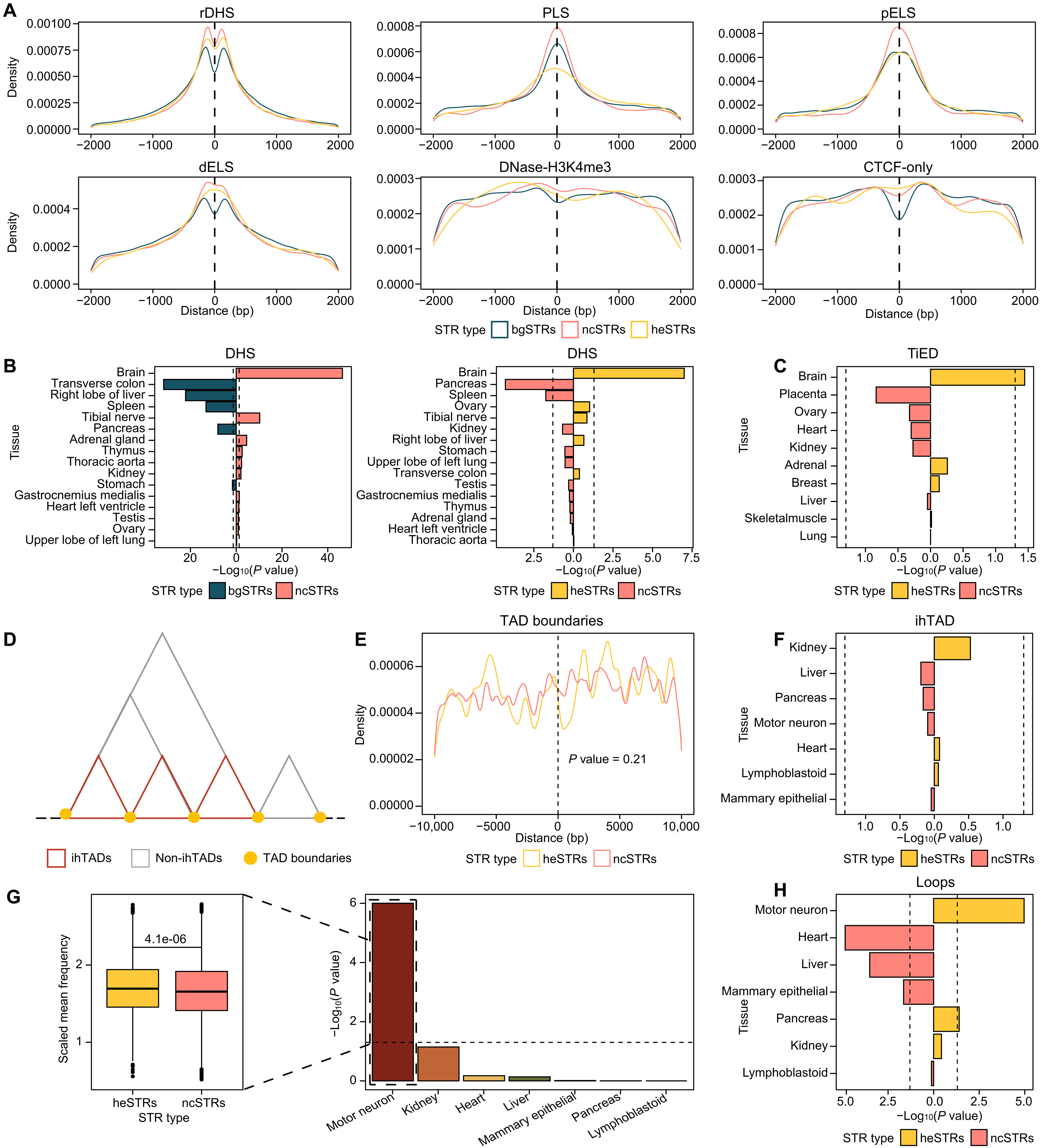 研究发现,heSTRs显著富集于大脑和神经元特异性的调控信号中。与保守型STRs相比,heSTRs与脑特异性DHS(DNase超敏位点)的关联性更强,并且富集在大脑特异的增强子中,提示其在远程调控中发挥重要作用。通过整合3D基因组结构数据,研究进一步发现heSTRs显著富集于神经元特异性的染色质环结构和拓扑关联结构域中。