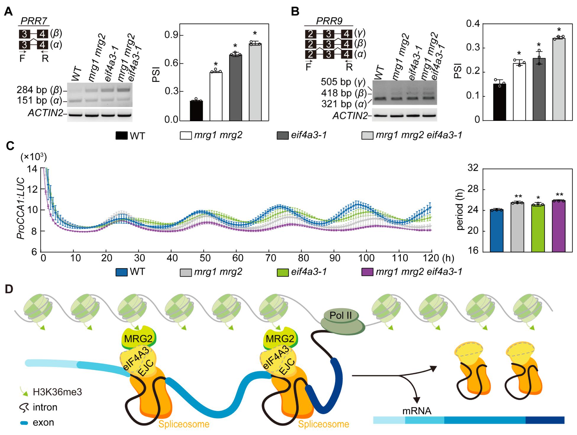 A, B. MRG1/MRG2和eIF4A3调控生物钟核心基因PRR7(A)和PRR9(B)的可变剪接;C. MRG1/MRG2和eIF4A3为维持拟南芥正常昼夜节律所必需;D.阅读蛋白MRG2识别H3K36me3修饰,招募剪接体亚基eIF4A3,共同调控转录偶联的可变剪接过程。