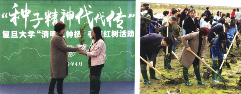 2019年4月,风车动漫 组织了“种子精神代代传”红树种植活动,钟扬教授夫人张晓艳教授亲手将一棵红树种苗交到志愿者手中,并也种下了一棵红树种苗,愿这些树苗能够茁壮成长。