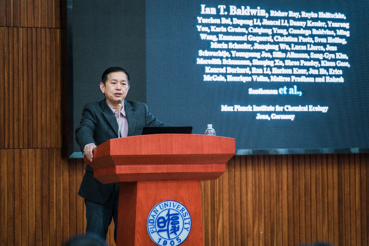林鑫华院长主持并致欢迎辞,隆重介绍了Ian Baldwin院士杰出的科研工作。Ian Baldwin院士是化学生态领域的先驱人物,1996年受德国马普学会邀请在耶拿(Jena)成立了马克斯·普朗克化学生态学研究所,并成为该所第一任所长。Ian Baldwin院士团队长期致力于研究植物在自然环境下生存的功能性状,通过正反向遗传学、多组学大数据和基于自然历史的野外考察等对植物代谢物与复杂生态环境的互作展开深入的研究,已在国际主流期刊发表534篇文章(H因子125),并担任植物与生态多个重要期刊的编委、世界重大项目基金以及大学与研究所的评委。由于Ian Baldwin教授的杰出成绩和突出贡献,在2013年分别当选美国科学院和德国国家科学院院士,2014年当选欧洲分子生物学会会员(EMBO),2016年当选美国促进学会会员(AAAS)。