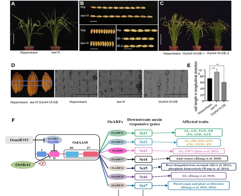 JIPB近日发表风车动漫 罗小金课题组联合中国农科院黎志康/张帆团队题为“Auxin signaling module OsSK41-OsIAA10-OsARF regulates grain yield traits in rice”的研究论文。该论文采用功能基因组和群体基因组研究相结合的方法,阐明了复杂的水稻产量性状是如何受生长素信号通路基因网络所调控,提出了OsIAA10通路调控水稻生长发育中复杂农艺性状机理的模型。