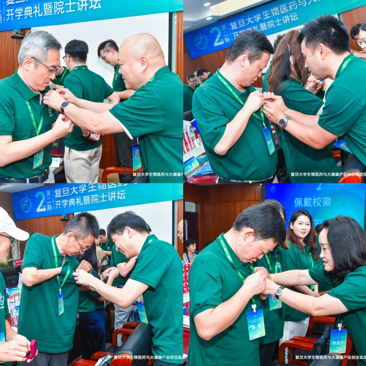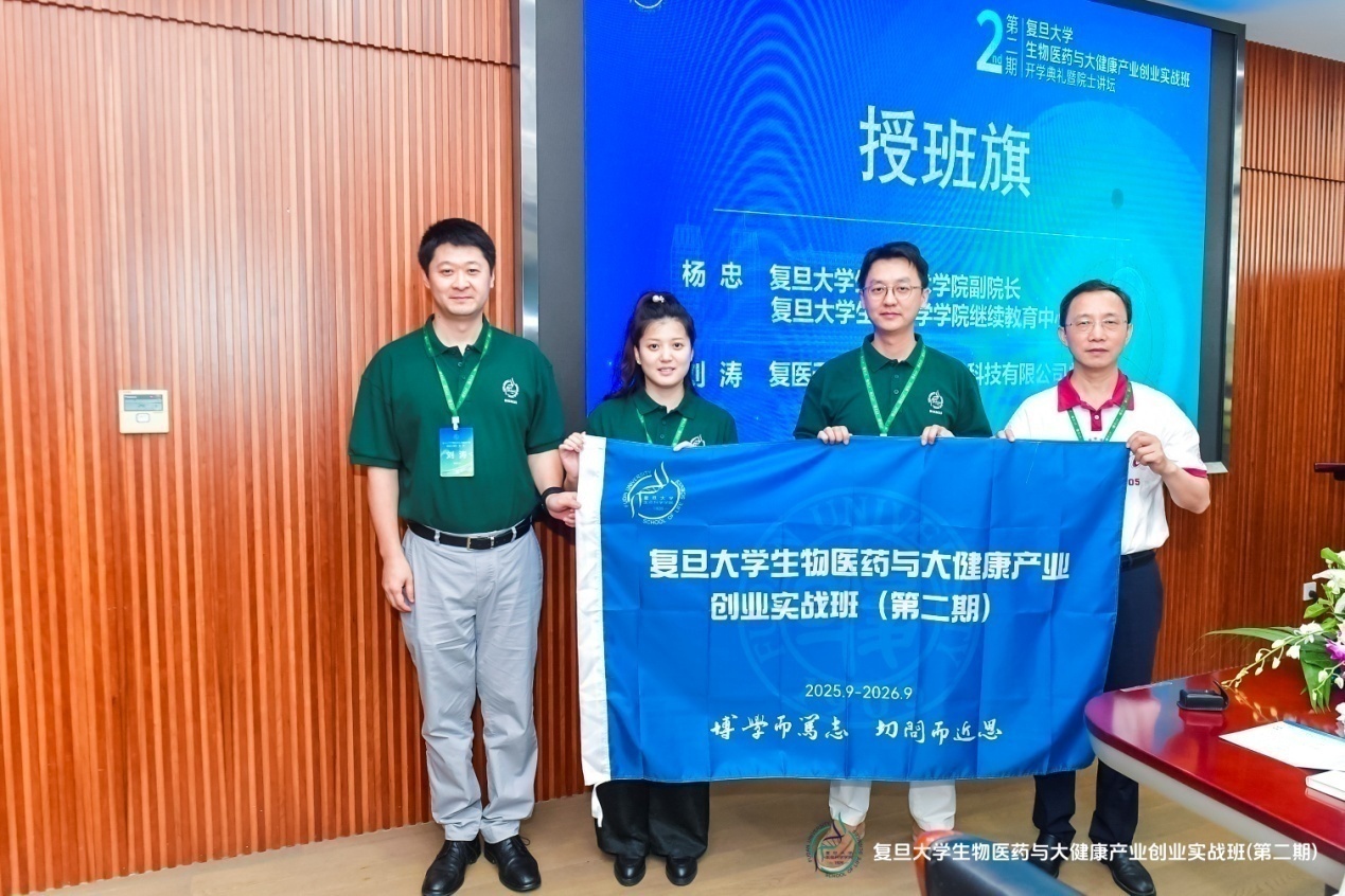 在全场瞩目下,授班旗与佩戴校徽仪式顺利举行。象征着责任与使命的班旗被郑重交予二期班代表,首期班学员代表为第二期新学员佩戴复旦校徽。当校徽稳稳别在胸前,学员们眼中满是对未来学习的期待,新同学代表:上海昇敞生物科技有限公司总经理周晶铭和依钲(上海)生物科技有限公司总经理詹诸明同学分别发言,百战归来再读书是应对不确定时代最好的方式。此刻也标志着他们正式成为复旦生物医药与大健康产业创新阵营的一员。