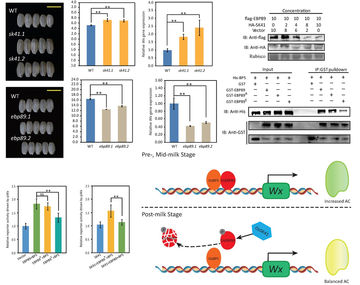 OsSK41通过影响OsEBP89的稳定性来调控Wx基因的表达,负调控水稻直链淀粉含量