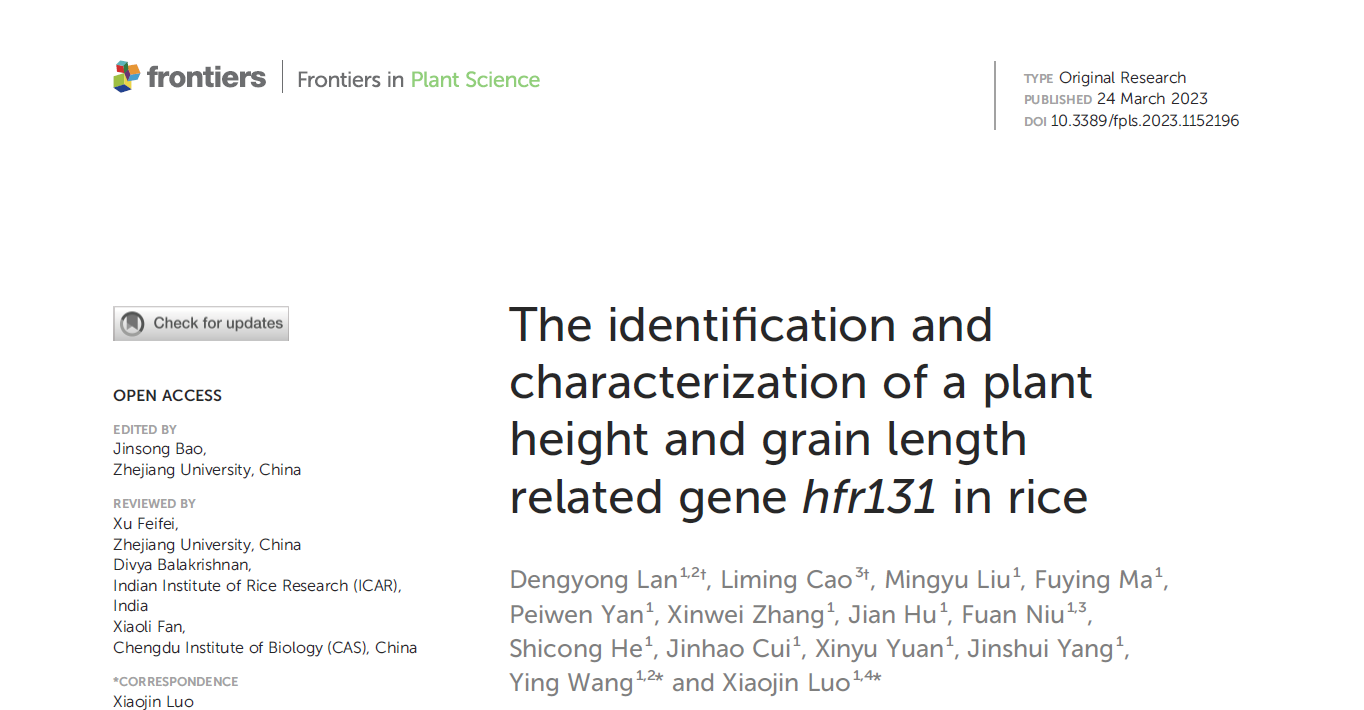 2023年3月24日,风车动漫 罗小金课题组在Frontiers in Plant Science在线发表了题为“The identification and characterization of a plant height and grain length related gene hfr131 in rice”的研究论文。该研究采用功能基因组和群体基因组相结合的方法,揭示了BR与生长素协调调控水稻株高和粒型的机制,发现了有利于提高水稻产量的优势单倍型组合。