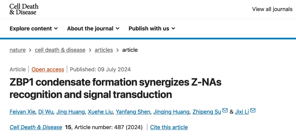 本研究表明ZBP1能够通过Zαβ结构域响应体内异常Z-NAs刺激后,形成一个液滴状凝聚体平台,使ZBP1易于通过RHIM结构域进行自身聚集并与下游蛋白(如RIPK1、RIPK3)结合,揭示了ZBP1在应对病原体感染的免疫反应中的具体调控机制。李继喜课题组长期从事细胞死亡与免疫应答研究。已发现坏死小体组分RIP1/RIP3形成功能性淀粉样纤维复合物,作为级联放大平台,激活程序性细胞坏死(2012,Cell);通过结构生物学方法解析了坏死小体的高分辨率三维结构(2018,Cell);发现多个程序性细胞死亡的调控分子(TRIM21、TRIM25、SP1),并阐明相关作用机理(2021&2022,Cell Death Differ;2023 Mol Neurodegener; 2024 Cell Death Dis)。