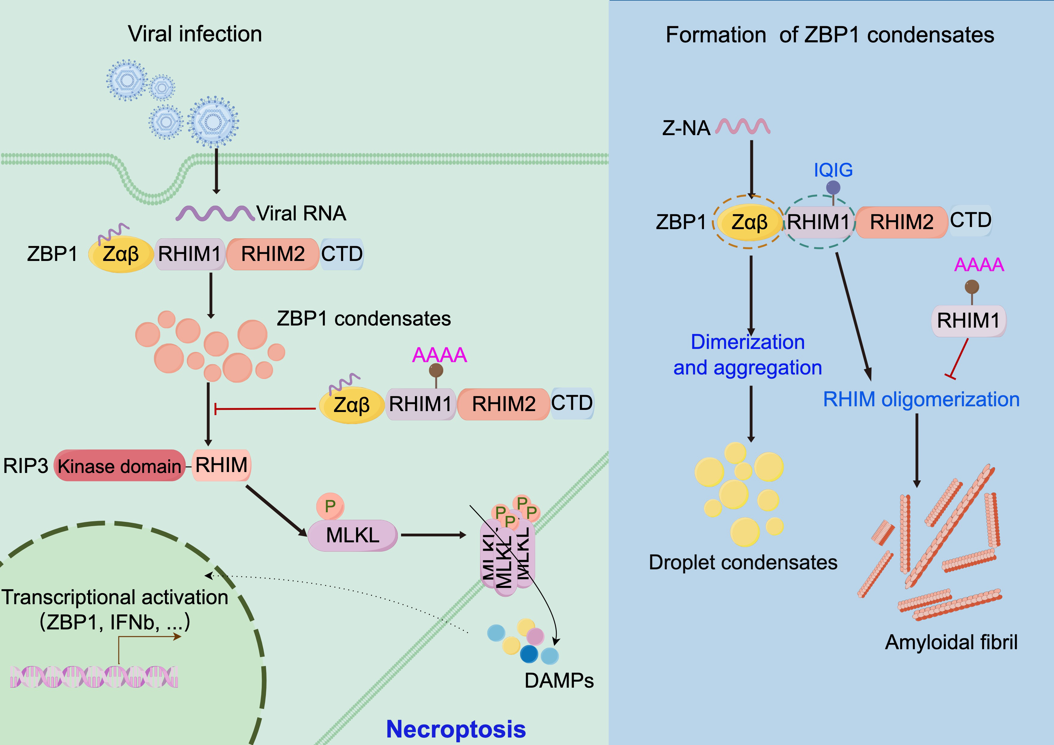 图1. ZBP1通过形成凝聚体来介导Z-NAs识别和下游信号转导