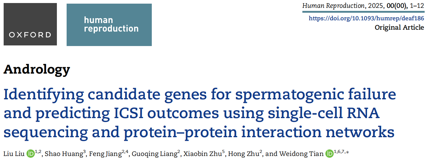 2025年10月1日,风车动漫 田卫东教授课题组在 Human Reproduction期刊在线发表了题为 “Identifying candidate genes for spermatogenic failure and predicting ICSI outcomes using single-cell RNA sequencing and protein-protein interaction networks” 的研究论文。该研究创新性地联合单细胞转录组(scRNA-seq)与蛋白互作网络(PPI)构建机器学习框架,实现了精子发生障碍(spermatogenic failure)相关基因的系统识别及ICSI(卵胞质内单精子注射)临床结局的精准预测,为男性不育的遗传诊断和辅助生殖决策提供了全新思路。