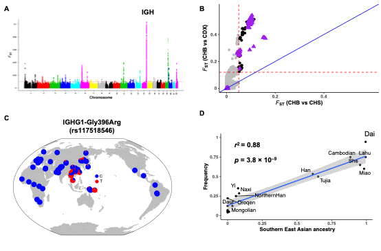 值得注意的是,来自尼安德特人遗传渗入的 rs117518546-T等位基因,在东亚南方人群中作为优势等位基因受到正向自然选择。一项针对接种季节性流感疫苗的健康志愿者队列的研究显示,携带此等位基因的个体,其流感病毒特异性的IgG1抗体的应答水平显著高于非携带者。该等位基因同时也是东亚人群特异性的系统性红斑狼疮的风险等位基因。这提示受到自然选择的等位基因可以增强机体的免疫反应,协助机体抵御病原体入侵,另一方面在免疫系统异常的情况下,会提高罹患系统性红斑狼疮的风险。该等位基因在东亚人群中广泛存在,在欧美人群中缺失,提示不同人群的免疫反应存在差异。