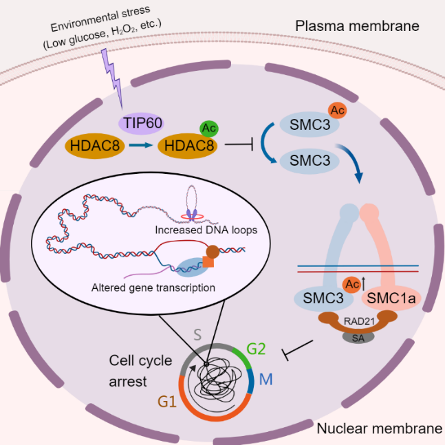 本研究发现HDAC8作为一个去乙酰化酶存在乙酰化修饰,负向调控其酶活,且HDAC8乙酰化水平在细胞周期过程中表现出动态变化。有趣的是,外部环境刺激比如葡萄糖剥夺能够促进乙酰基转移酶Tip60催化HDAC8乙酰化,导致粘连蛋白cohesin亚基SMC3乙酰化水平增加和细胞周期停滞。此外,构建模拟HDAC8乙酰化突变的细胞表现出广泛的基因转录表达变化,这可能与三维基因组结构的改变尤其是染色质环的增强有关。数据还表明,HDAC8乙酰化通过破坏细胞周期相关基因的表达和姐妹染色单体的粘连,负向调控细胞周期进展,导致G2/M期停滞。这些发现阐明HDAC8的可逆乙酰化修饰作为一种新的细胞周期调控因子,拓展了对细胞周期动态调控过程的理解,尤其是应激响应机制。