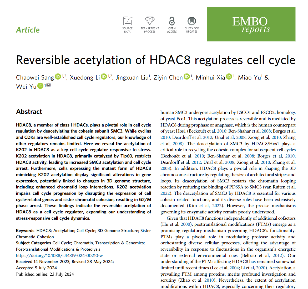 余巍组在EMBO Reports在线发表题为“Reversible acetylation of HDAC8 regulates cell cycle”的文章,该研究揭示了HDAC8的可逆乙酰化修饰作为应激响应的关键细胞周期调节因子。