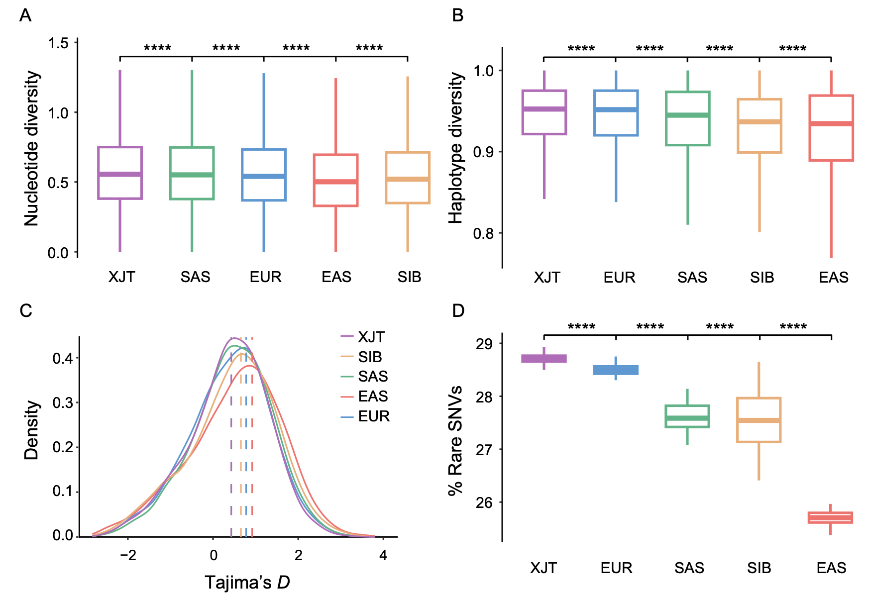 图2. 新疆塔吉克族及其祖源参考人群的遗传多样性特征