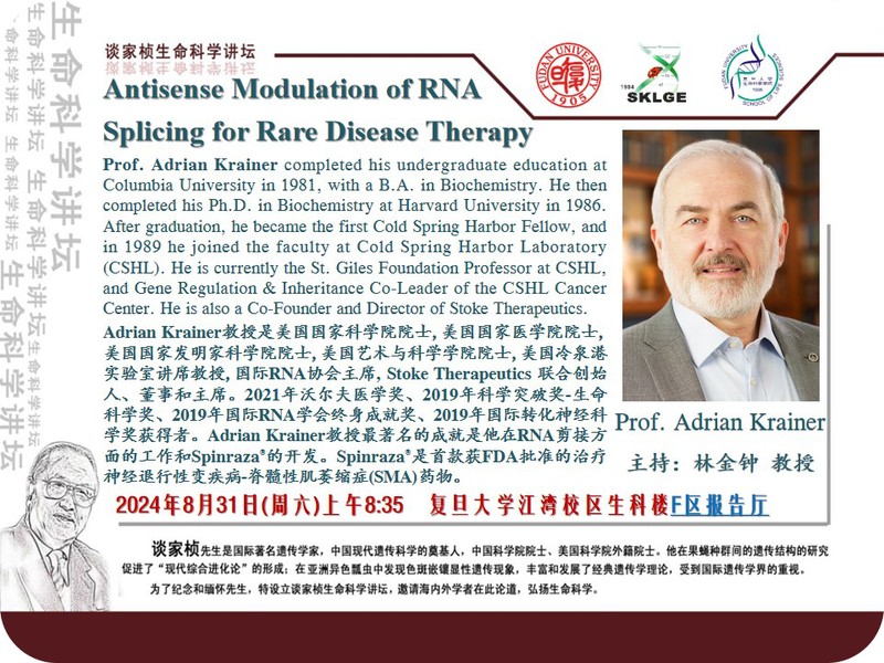 谈家桢生命科学讲坛-8月31日(周六)上午8:35,Adrian Krainer 教授(美国国家科学院院士),生科院F报告厅