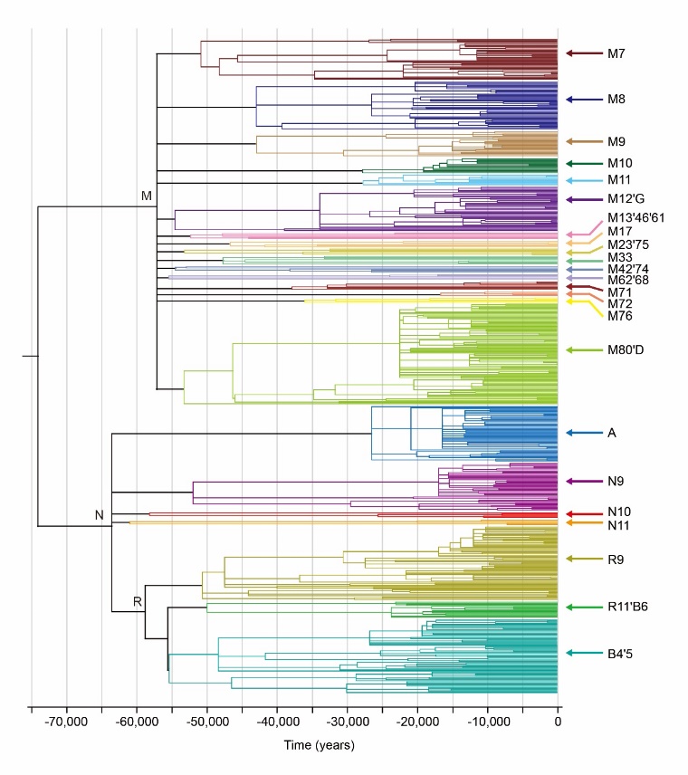 图1高精度东亚线粒体DNA进化树示意图