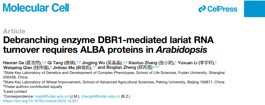 2025年11月20日,郑丙莲教授课题组在Molecular Cell发表了题为“Debranching enzyme DBR1-mediated lariat RNA turnover requires ALBA proteins in Arabidopsis”的研究论文。该研究系统地鉴定了DBR1介导的套索RNA降解的关键辅因子ALBA蛋白家族。研究结果发现ALBA蛋白通过双重机制促进套索RNA代谢:一方面增强DBR1酶活,另一方面辅助其识别套索RNA,从而维持套索RNA的代谢稳态和生物个体的正常发育。
