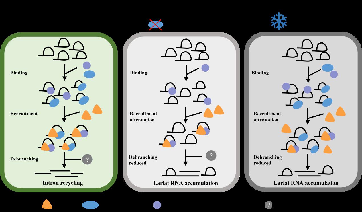 图注:左:正常条件下,DBR1与ALBA相互作用促进套索RNA降解,确保高效RNA代谢和内含子正常回收。中:在alba突变体中,ALBA的缺失损害了套索RNA的结合能力,导致DBR1结合套索RNA减少,从而引起去套索RNA降解效率降低。右:冷胁迫条件下,ALBA与DBR1相互作用减弱,DBR1降解套索RNA的效率降低,导致套索RNA积累,降低植物的胁迫适应能力。