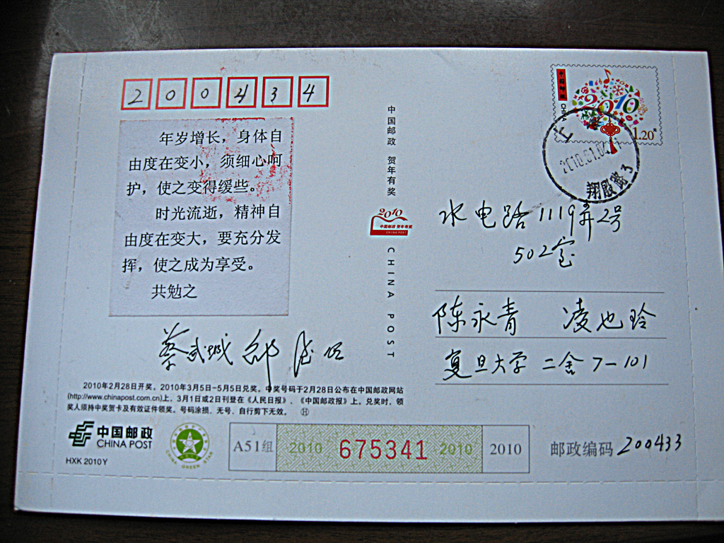这是二位学长的贺卡,文人的贺卡,亲切、暖意、温馨的贺卡。我拿着这张贺卡,喜出望外,急切返回家中告诉老伴,我们俩收到了买不到的礼物,抚卡重读,倍觉师情友情融在贺卡的真情之中。