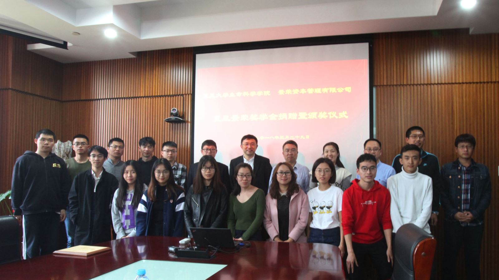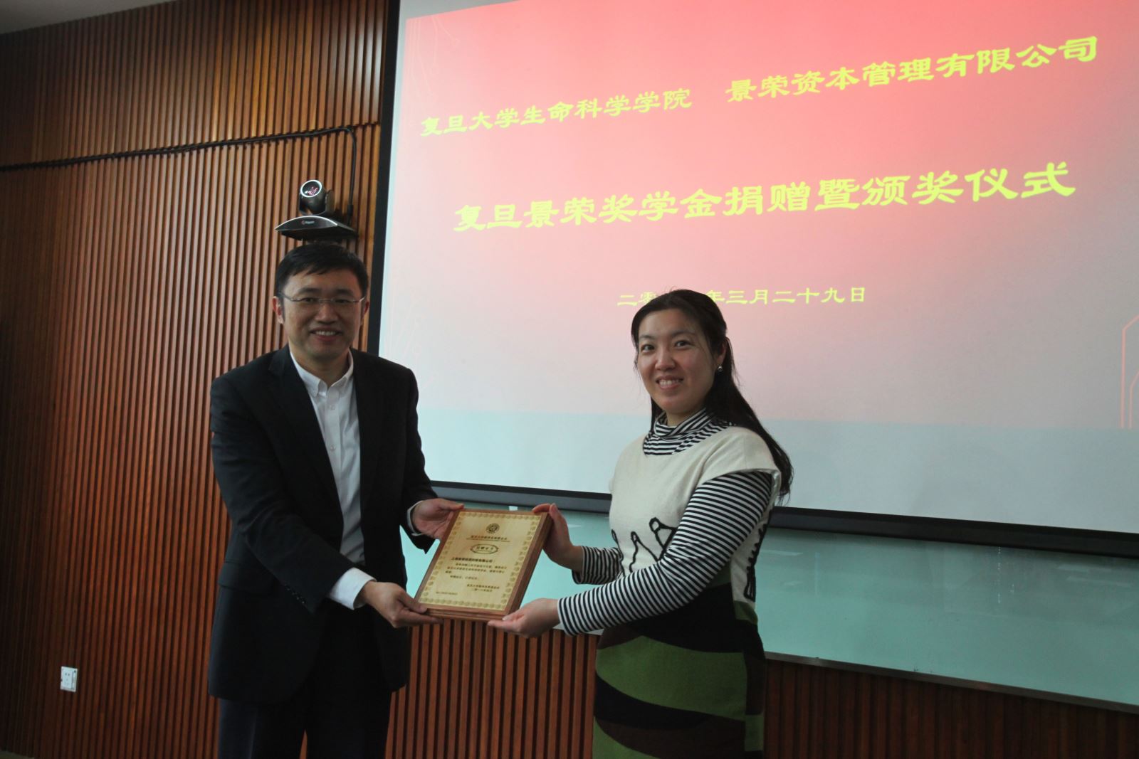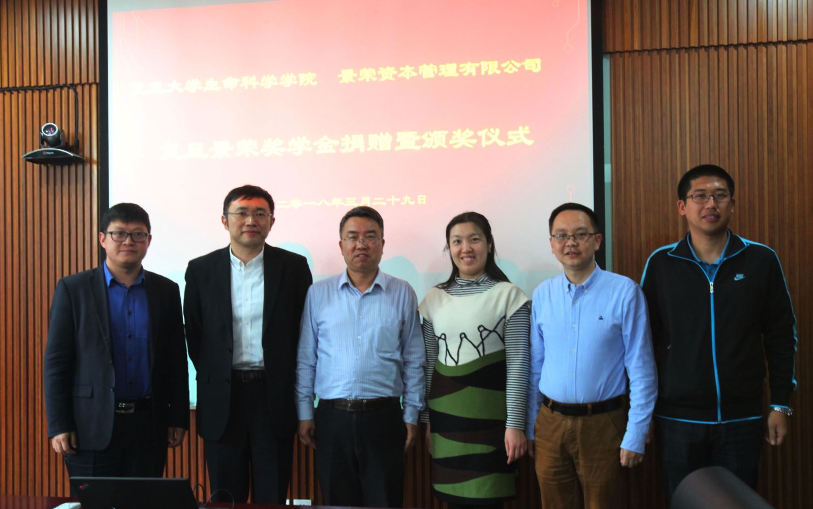 2018年3月29日下午,复旦景荣生命科学奖学金捐赠暨颁奖仪式在风车动漫 A208会议室隆重举行,风车动漫 对外联络与发展处副处长陆颖丰,风车动漫 副院长、学院全球校友会执行会长卢大儒,学院党委副书记余文博,研工组组长李一苇,上海景荣资本副总裁、景旭创投创始合伙人、学院1997级校友钱庭栀,景旭创投投资总监、学院1997级校友时锋出席了颁奖仪式,会议由卢大儒会长主持。