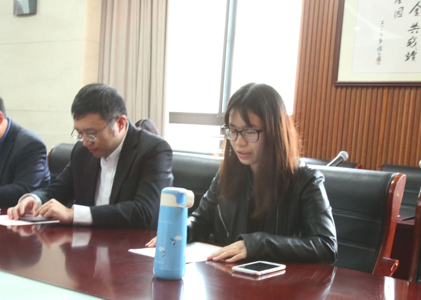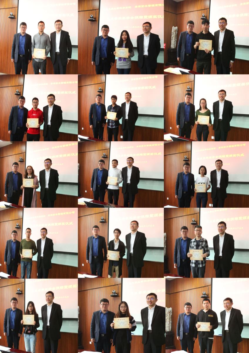 钱庭栀校友宣读获奖学生名单,与景旭创投投资总监时锋校友一起为获奖学生颁发证书。