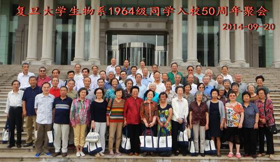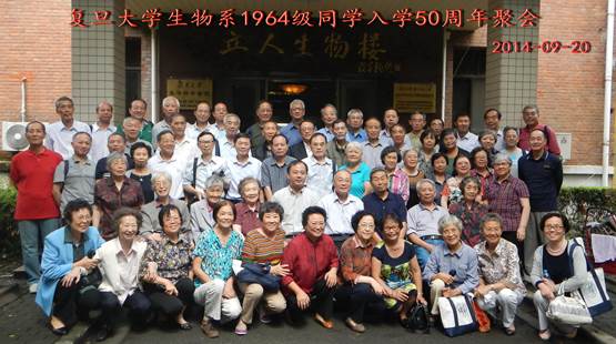 50周年。1964级当年的班主任老师应邀出席。聚会上播放了精心制作的PPT,展现了同学当年的风华英姿和六年的大学生活,校友们共叙旧情,欢乐开怀。六年的相伴,是缘份;四十四年的分别,存情谊。各班代表分别介绍了本班同学的情况。在一片掌声中,生命学院党委书记陈浩明老师代表生科院全体师生,欢迎各位校友回到母校。同学们一致表示感谢老师的关心爱护,感谢学校的关怀培养。聚会活动期间,校友们重温了在生物楼的各种教学活动,目睹了邯郸老校区的变化,参观了江湾新校区生命学院大楼,对生科院取得的成绩感到高兴,为母校的发展感到欣喜。聚会之后,校友们纷纷发来纪念照片和聚会感言。