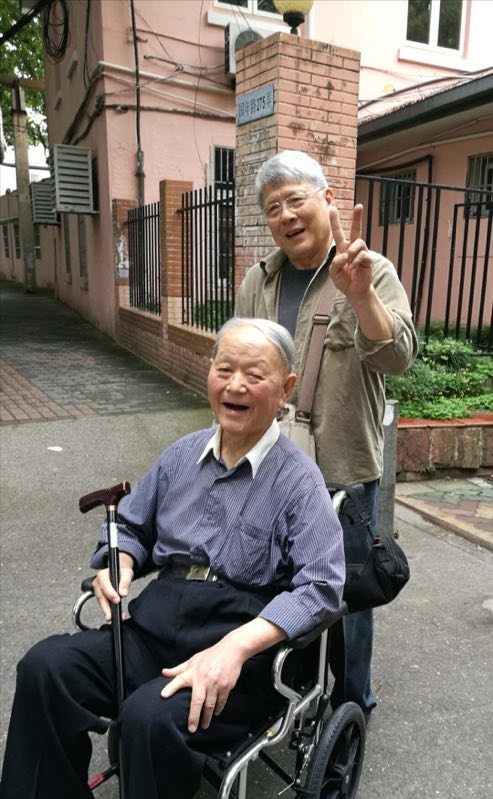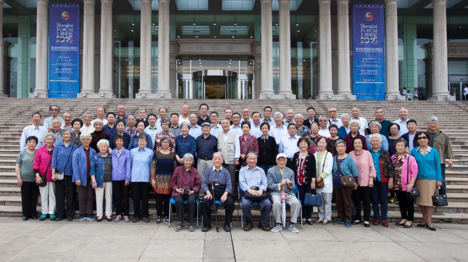 上午另一项重要活动是集体合影。在光华楼前,校友们簇拥着当年指点人生和传授知识的四位恩师:刘文龙先生,邵德明、蔡武城伉俪先生,柴建华先生。四位先生都已经八九十岁,邵先生还是用轮椅推过来的。校友中两位众望所归的“资深摄影师”早有准备,他们架好三角架,从容指挥调度,引来了附近路过师生纷纷驻足观望。随着声声“咔嚓”,弥足珍贵的世纪合影记录下了这庄重又温馨的历史时刻,第二天,这一份情谊又飞向了各位校友的微信和邮箱……
