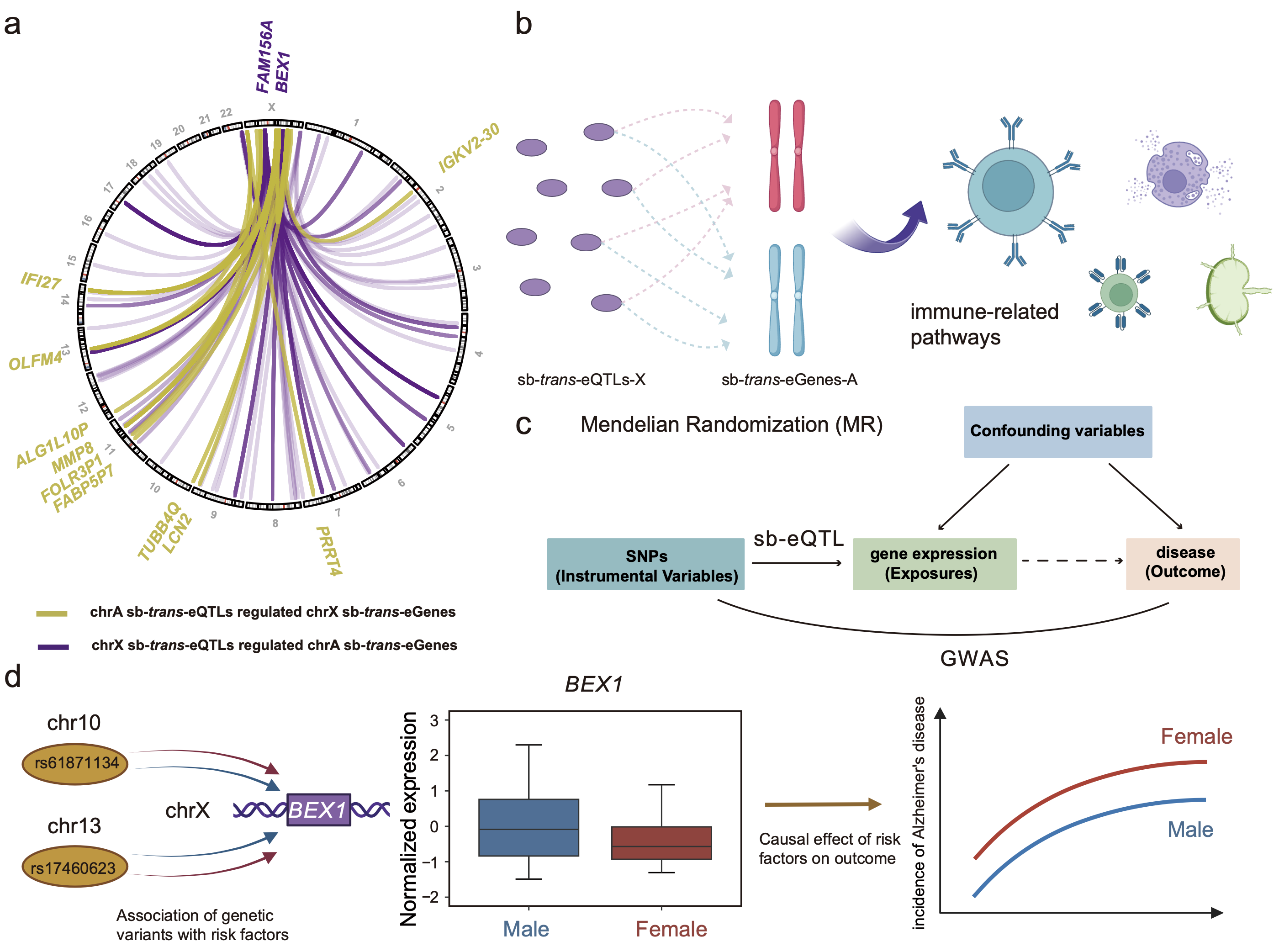此外,通过评估常染色体和X染色体之间的交互作用效应,研究团队发现常染色体在复杂性状和疾病的性别差异中扮演着至关重要的角色,表明人体的性别差异不仅仅由性染色体上的基因决定,从而加深了对基于性别差异的复杂性状和疾病发生及其遗传基础和分子机制的理解。(图4)