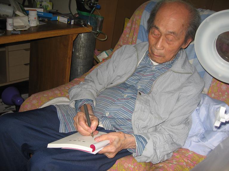 我坚信他说的话。你看他九十五岁高龄,拿起笔签名,手不抖,座椅边常有五本新潮的书,他轮番阅读。书房里挂着弘一法师书写送给他的条幅,墙上还有他自己早期的人体艺术画作品。他很喜欢看世界杯女子足球比赛……心理年龄有多年轻哦!我问他:“现在最想要的是什么?”他说:“最好有人与我下围棋。”院党委副书记、负责学生工作的小蒋在旁当场答应他,在学校和院的围棋队学生中派出好手上门对弈,他开怀大笑说:“谢谢满足我的愿望。”我好奇的问他晚上几点睡觉,他回答我:“晚上12点以后。” “为什么要这么晚?”我再问。“早了睡不着,习惯就是这样。”言谈中毫无怨天怨地怨自己老的感觉。