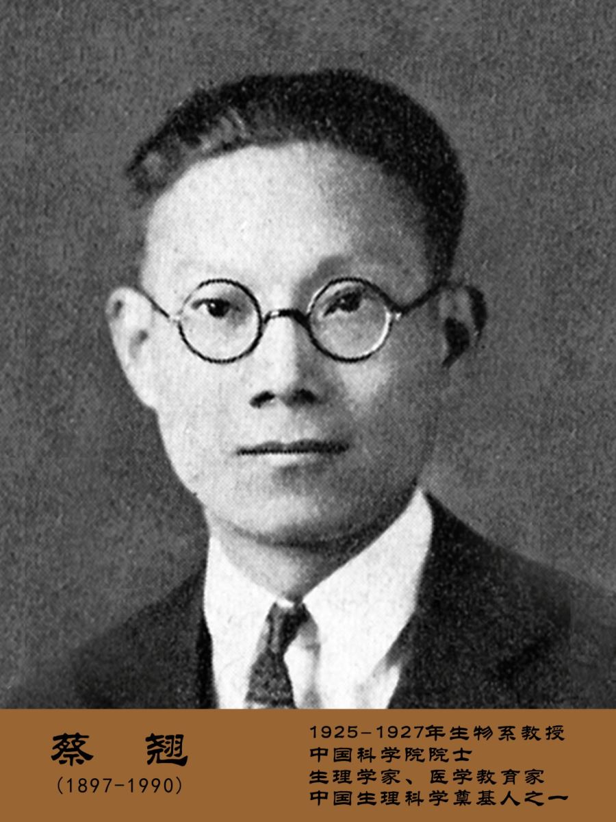 蔡翘(1897-1990) 1925-1927年生物系教授、中国科学院院士、生理学家、医学教育家、中国生理科学奠基人之一。1920年代首先发现视觉与眼球运动功能的中枢部位——顶盖前核(后称蔡氏区)。编著中国第一本大学生理学教科书。他在中国多所著名医学院校担任学术领导及教学、科研工作,在神经解剖、神经传导生理、糖代谢和血液生理等领域有许多重大发现,并为中国的航天航空航海生理科学研究奠定了基础。