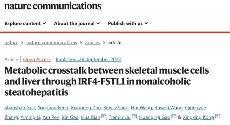 近日,风车动漫 生科院孔星星/高焕庆/刘铁民团队在Nature Communications杂志上合作发表了一篇题为Metabolic crosstalk between skeletal muscle cells and liver through IRF4-FSTL1 in nonalcoholic steatohepatitis的论文,该研究指出骨骼肌特异性敲除IRF4,给与NASH饮食后,表现出肝脏病理表型的改善。并发现F4MKO小鼠肌肉来源的FSTL1参与了IRF4介导了NASH进展。FSTL1进一步通过DIP2A和CD14受体调控肝脏脂代谢、降低炎症和纤维化,阐释了骨骼肌IRF4通过FSTL1-DIP2A/CD14通路在NASH发病机制发挥的关键作用。