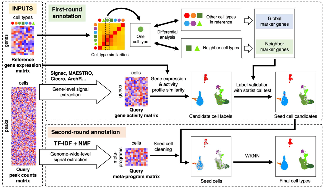 单细胞 ATAC-seq(scATAC-seq)能够捕获单细胞水平的染色质开放信息,是用于研究基因调控和细胞异质性的重要方法之一。细胞注释是 scATAC-seq 数据分析中非常重要的一步,然而,scATAC-seq 数据由于其高维度、高稀疏度、高噪音的特点,使得细胞注释较为困难。大多数现有的注释方法单纯基于基因活性,这有可能会忽略大量基因间区的信息。还有一些方法基于多模态整合后的标签转移,这容易受到批次效应的影响,并且可能会忽视稀有的细胞类型。