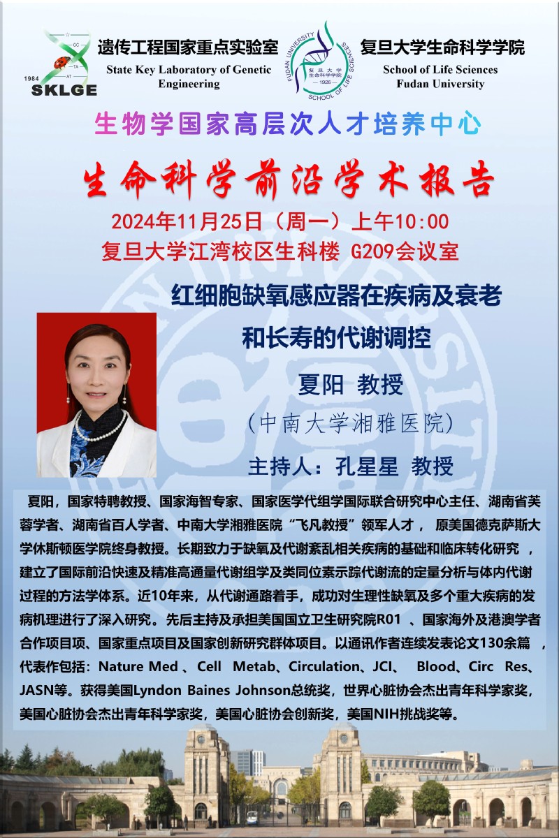 生命科学前沿学术报告--2024年11月25日(周一)上午10:00,夏阳 教授,中南大学湘雅医院