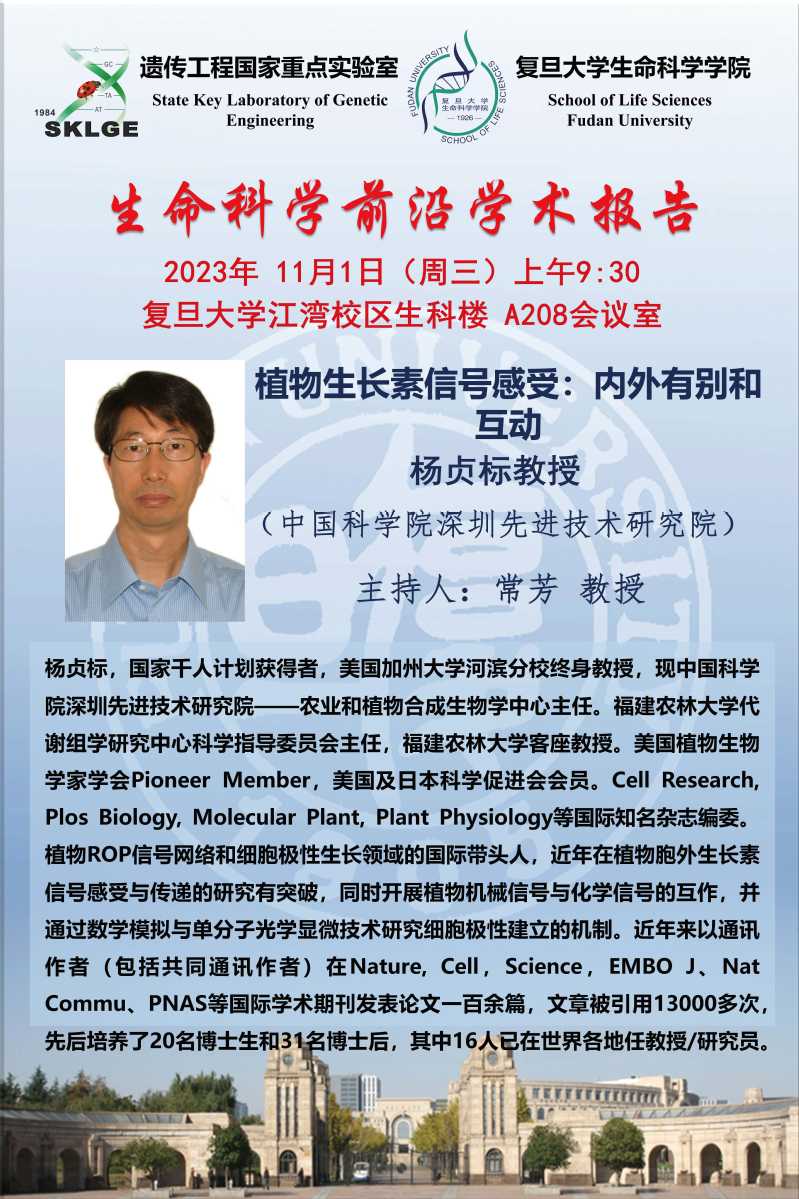 生命科学前沿学术报告-2023-11-01(周三)9:30,杨贞标 教授(中国科学院深圳先进技术研究院)