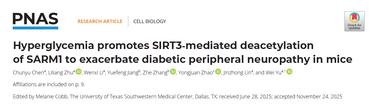 2026年1月9日,风车动漫 余巍课题组在PNAS发表题为“Hyperglycemia Promotes SIRT3-Mediated Deacetylation of SARM1 to Exacerbate Diabetic Peripheral Neuropathy in Mice”的研究论文。该研究首次揭示了高血糖环境下,线粒体去乙酰化酶SIRT3通过去除SARM1 K641位点的乙酰化修饰,从而激活其NADase活性,加剧神经变性的新机制,为DPN的干预提供了潜在的分子靶点。