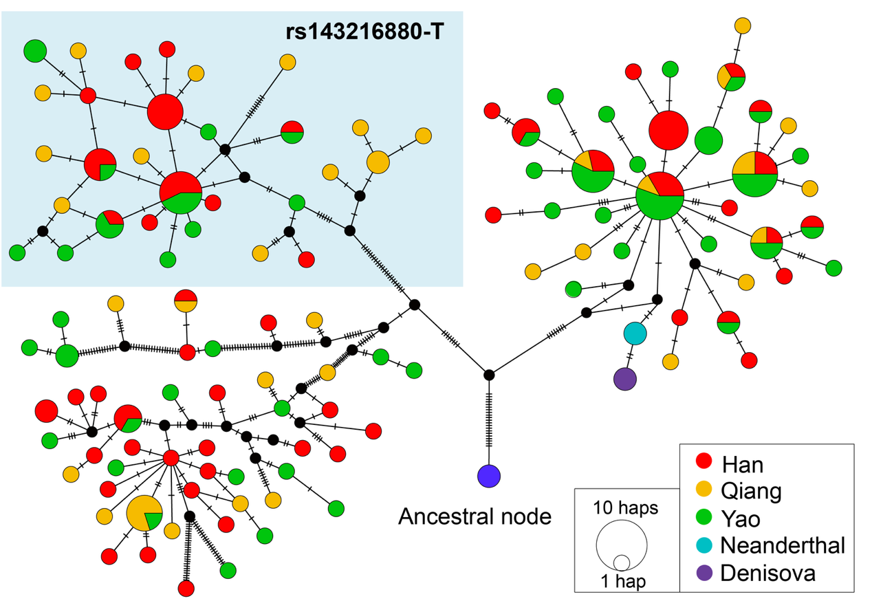 除了祖源结构差异外,研究还发现羌族两个亚群在多个功能基因位点上表现出显著分化。一个有趣的发现是在汉化羌族中,与酒精代谢密切相关的 ADH1B和 ADH1C基因中“快速代谢酒精”的功能性变异频率明显升高,进一步的分析表明这些特征可能是由于混合和混合后选择共同作用导致这些关键突变在羌族内部产生遗传分化。尤为引人关注的是,研究团队在基因ANKRD36中发现了一个在羌族中高频存在,但在汉族罕见,在藏族及世界其他大多数人群中几乎不存在的错义突变(rs143216880, C>T)。进一步分析发现该错义突变与数十个eQTL存在强连锁关系进而构成了一个独特单倍型。之前的功能研究表明ANKRD36与血压调控相关,研究者推测,这一独特的在羌族中富集的单倍型可能通过调控ANKRD36的表达和影响蛋白质结构进而影响表型心血管生理过程,帮助羌族人群适应中高海拔环境中的慢性缺氧压力。有趣的是,该非同义突变在羌族中的起源时间可追溯至~4.6万年前,比其他携带该突变的人群如汉族和瑶族中的都要古老,代表了东亚人群中一条极为古老且保存至今的遗传支系,表明羌族保留了东亚的基底遗传谱系。