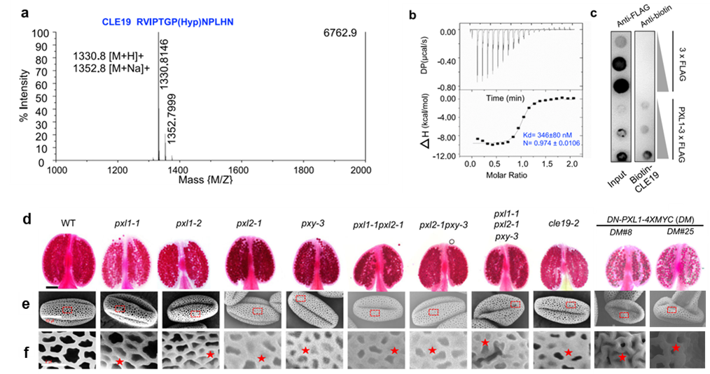 在此基础上,最新发表的这篇研究阐明了CLE19直接与PXL1的胞外LRR结构域相互作用,诱导PXL1磷酸化;并促进PXL1与SERKs共受体的相互作用及交互磷酸化,从而顺利将细胞间信号转化为胞内信号,最终保障花粉正常发育。本研究找到了CLE19信号长期以来未知的受体,阐明了PXL1受体接收CLE19小肽信号的关键结构域和核心氨基酸位点,同时为配子体协调其外界孢子体组织进行发育的分子机制提供了新思路。此外,该研究还表明了植物同一LRR受体激酶可以在不同组织中作为不同胞外小肽信号的受体,从而调控多个生理过程。