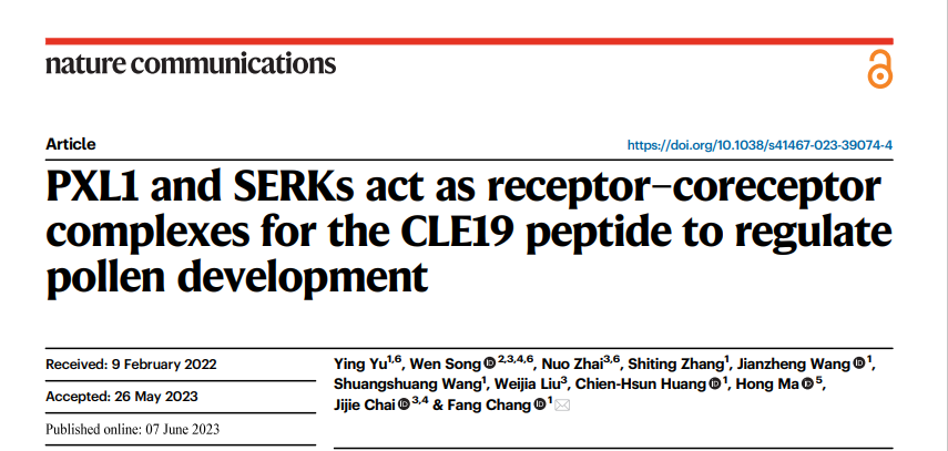 2023年6月7日,风车动漫 及遗传国重室的常芳团队联合清华大学柴继杰团队在Nature Communications《自然通讯》在线发表了题为“PXL1 and SERKs act as receptor-coreceptor complex for the CLE19 peptide to regulate pollen development”(PXL1和SERKs作为受体-共受体复合物介导CLE19小肽信号而调控花粉发育)的研究论文。该研究以拟南芥花药为模式系统,通过一系列实验证实了PXL1-SERKs是细胞外小肽CLE19的受体-共受体,揭示了该模块介导小孢子-花药壁体细胞间信号交流,进而维持花粉育性的分子机制。