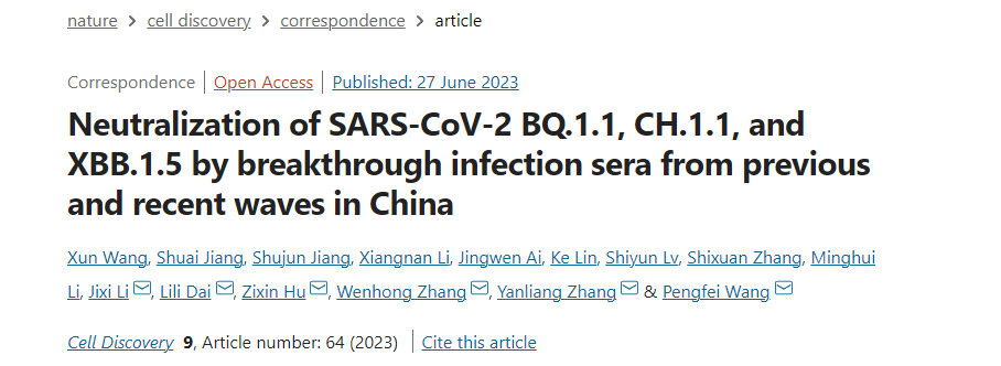 王鹏飞联合包括华山医院、南京中医院以及北京佑安医院在内的多个团队合作在国际权威杂志Cell Discovery在线发表了题为Neutralization of SARS-CoV-2 BQ.1.1, CH.1.1, and XBB.1.5 by Breakthrough Infection Sera from Previous and Recent Waves in China的论文,详细评估了新冠疫苗接种和中国主要几波突破性感染血清对奥密克戎包括BQ.1.1,CH.1.1和XBB.1.5在内的最新突变毒株的有效性。