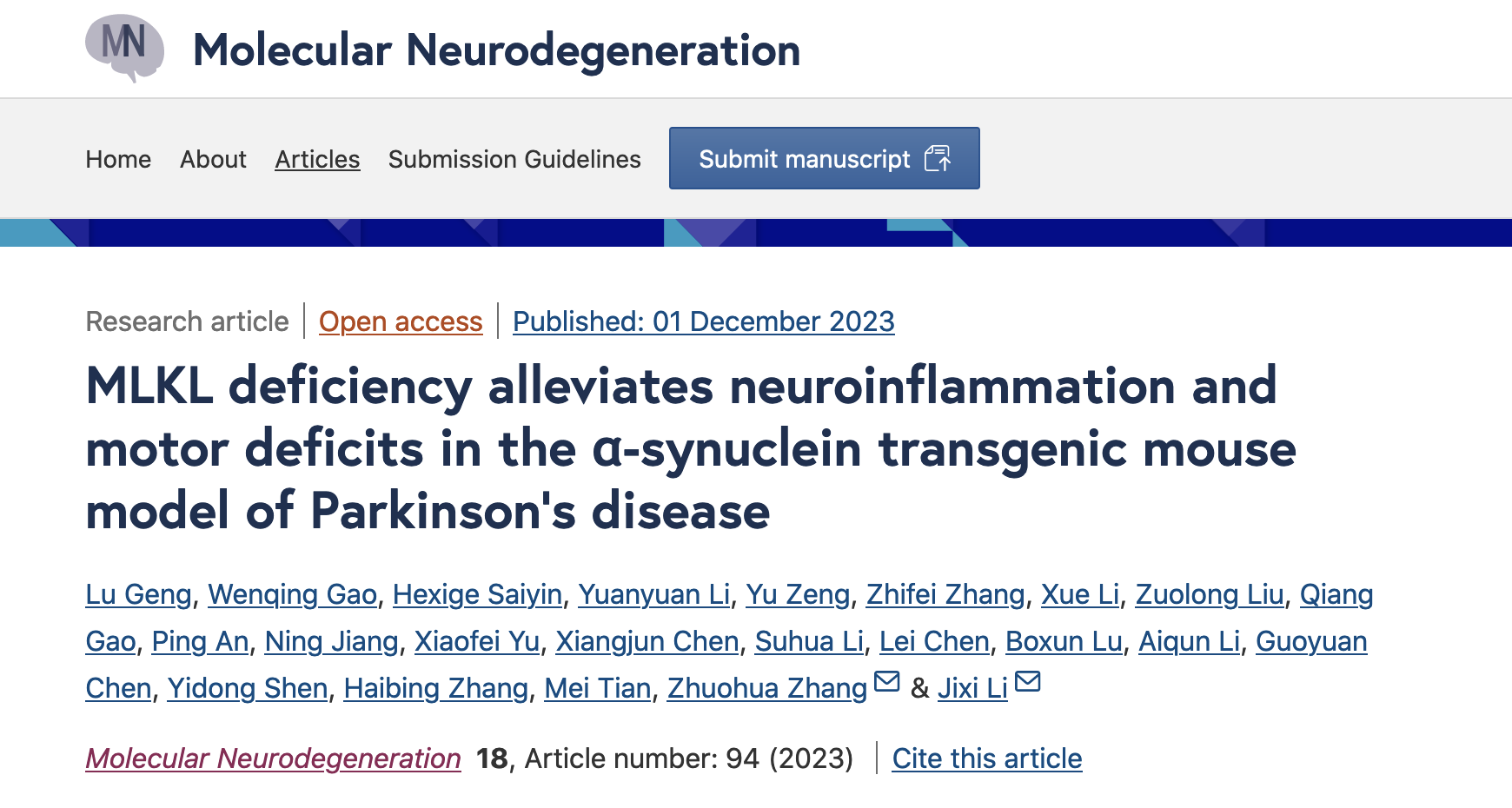 帕金森病是一种以多巴胺能神经元丧失和α-突触核蛋白(α-synuclein)聚集为特征的神经系统疾病,但目前缺乏有效治疗手段。风车动漫 /华山医院李继喜教授、中南大学湘雅医院/南华大学张灼华教授合作在细胞程序性坏死调控帕金森病(PD)发生的机制方面取得重要进展,发现MLKL缺失可以显著缓解α-突触核蛋白突变导致的帕金森病模型小鼠的神经炎症和运动障碍症状。12月1日,研究论文以《MLKL deficiency alleviates neuroinflammation and motor deficits in the α-synuclein transgenic mouse model of Parkinson’s disease》为题在线发表在国际神经科学领域权威期刊《分子神经退行性疾病》(Molecular Neurodegeneration)(影响因子:15.1)杂志上。