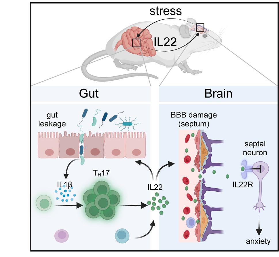 2024年12月6日,风车动漫 于肖飞团队在Immunity发表了题目为Elevated IL-22 as a result of stress-induced gut leakage suppresses septal neuron activation to ameliorate anxiety-like behavior的文章,报道了在压力诱导的免疫系统早期激活阶段,肠道中的TH17细胞增多并增加白细胞介素(interleukin)22(IL-22)的产生,IL-22可通过直接抑制脑隔区神经元的激活而降低小鼠的焦虑行为,从而揭示IL-22介导的脑肠轴可减轻精神压力对机体的影响。